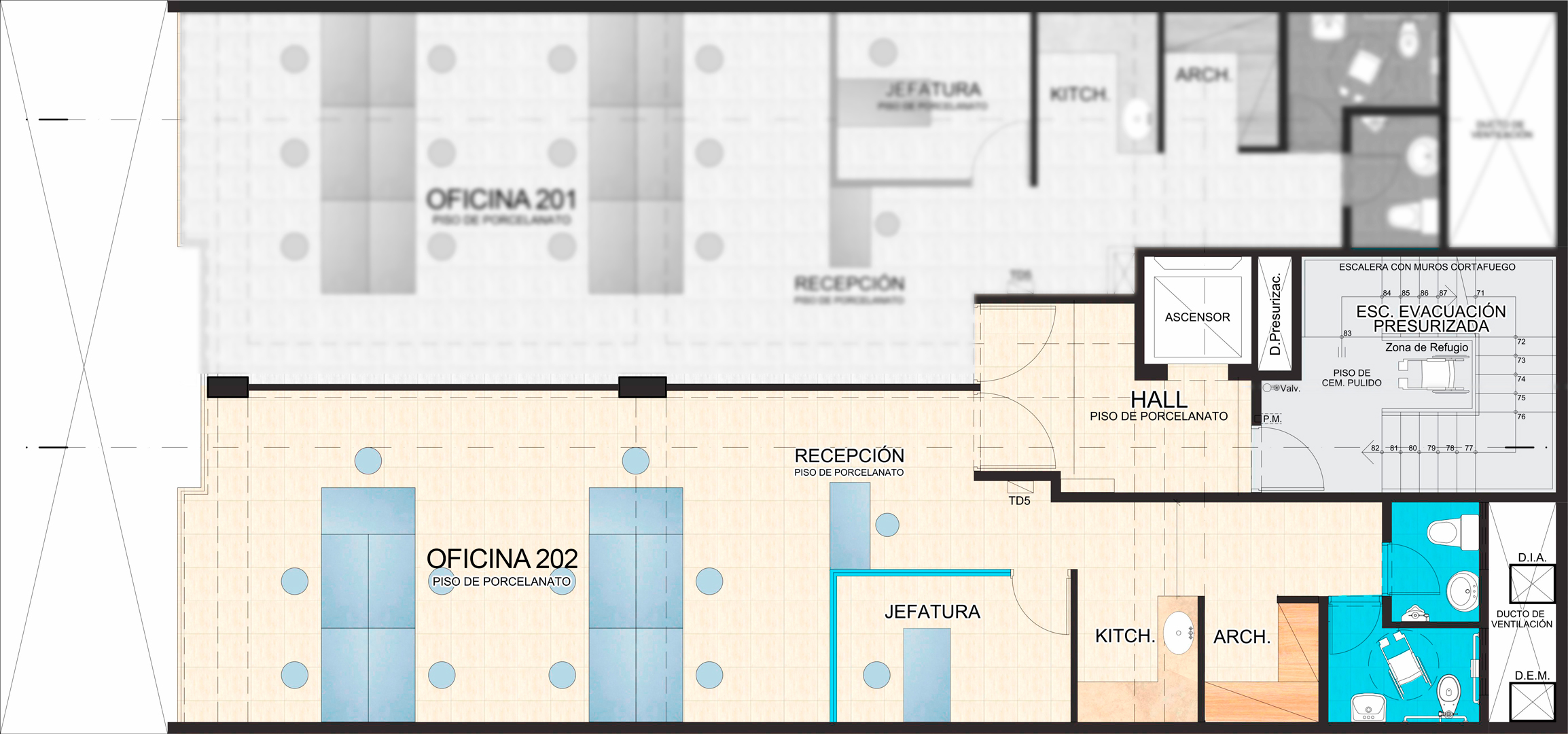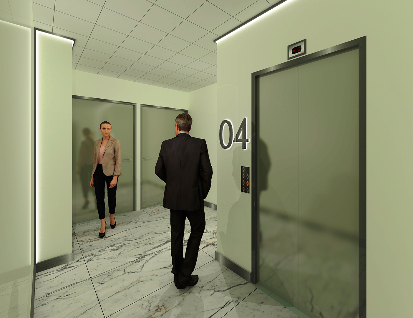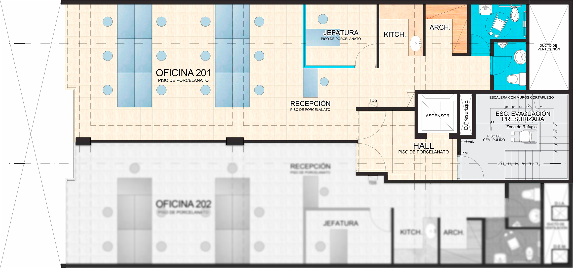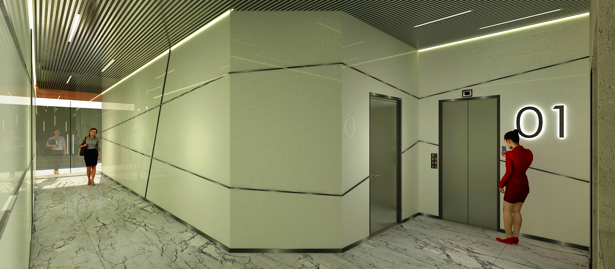 – (Recepción y Pasillos) con acabados de primera que dan imagen de modernidad, pisos terminados en mármol, paredes vitrificadas, destellos de acero inoxidable en cielo raso, trazos lineales de acero inoxidable en paredes, revestimiento de puertas de ascensor para cada piso en acero inoxidable, luces led en fachada y áreas comunes
