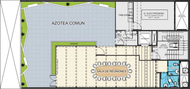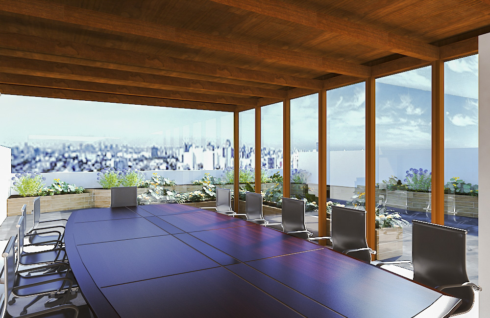 – Terraza y su sala de reuniones, con acabados que evocan la naturaleza por medio del uso de madera y decoración con plantas ornamentales, conservando un enfoque moderno y de recreación.