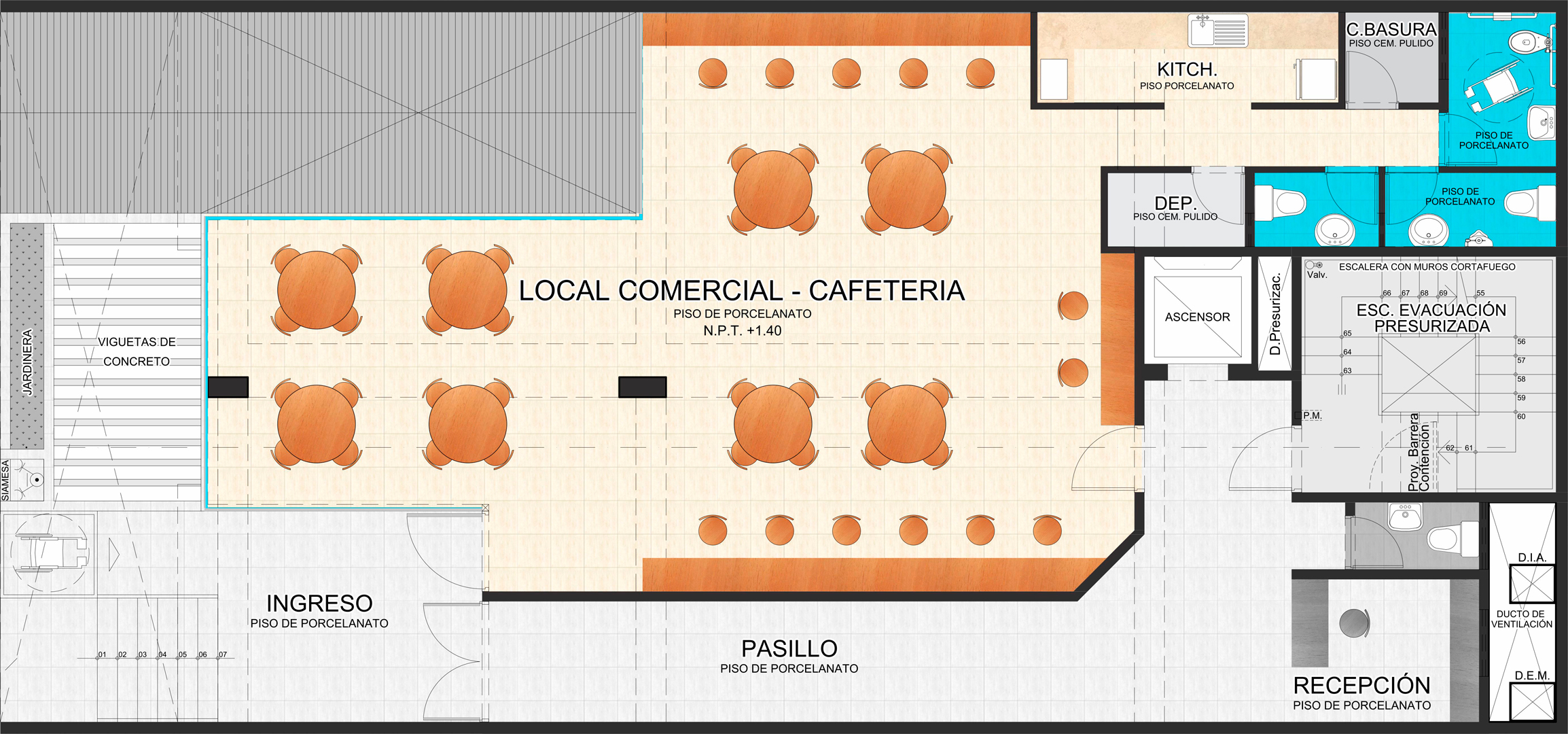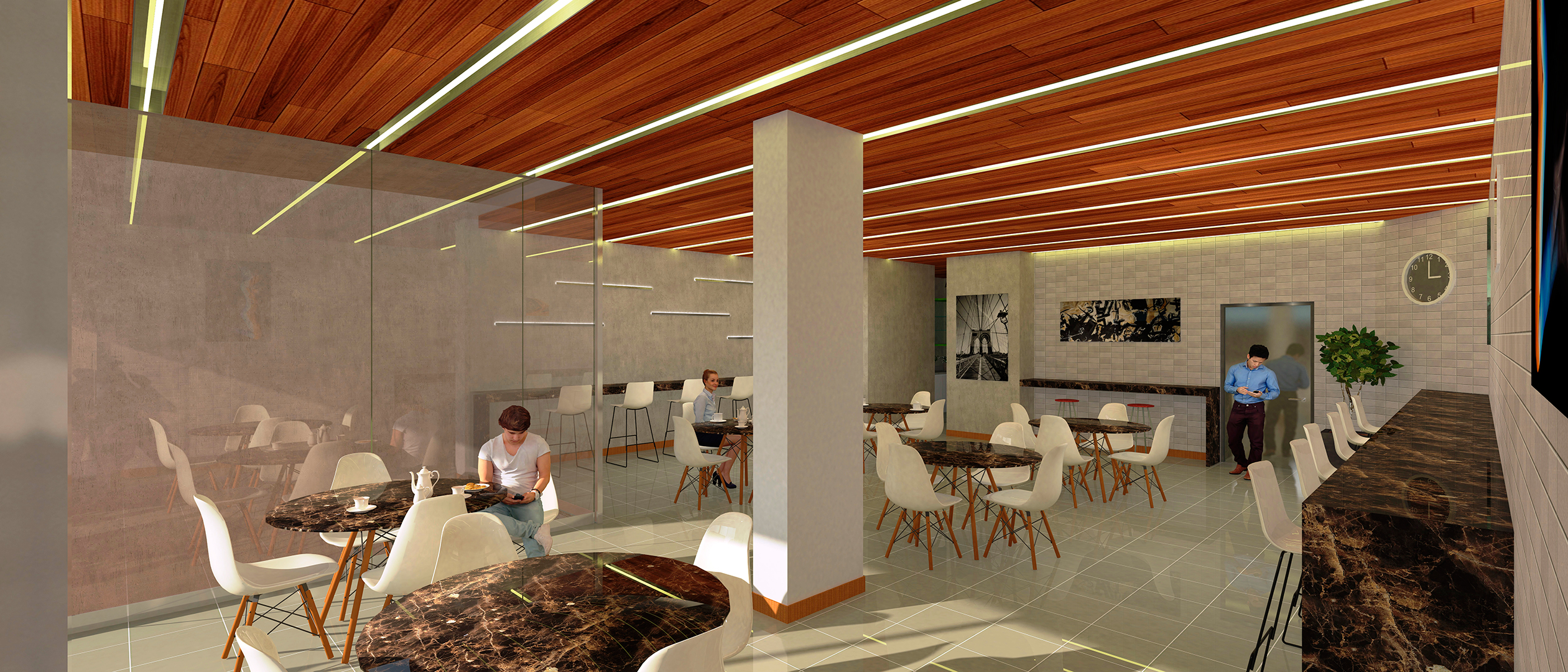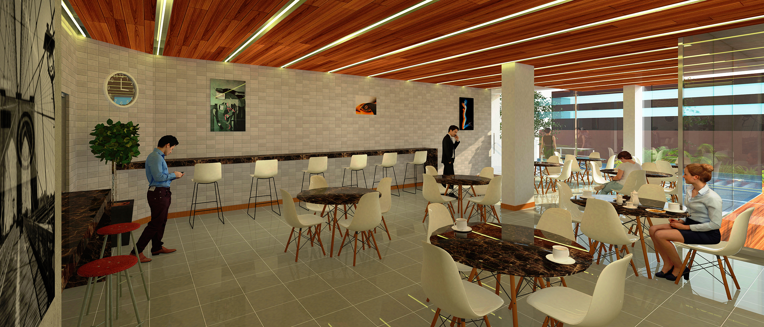– Cafetería, como algo complementario se ha diseñado un espacio comercial que permita a los usuarios del Centro de Oficinas tener un lugar de esparcimiento, donde puedan consumir alimentos o pasar tiempo de interés personal.